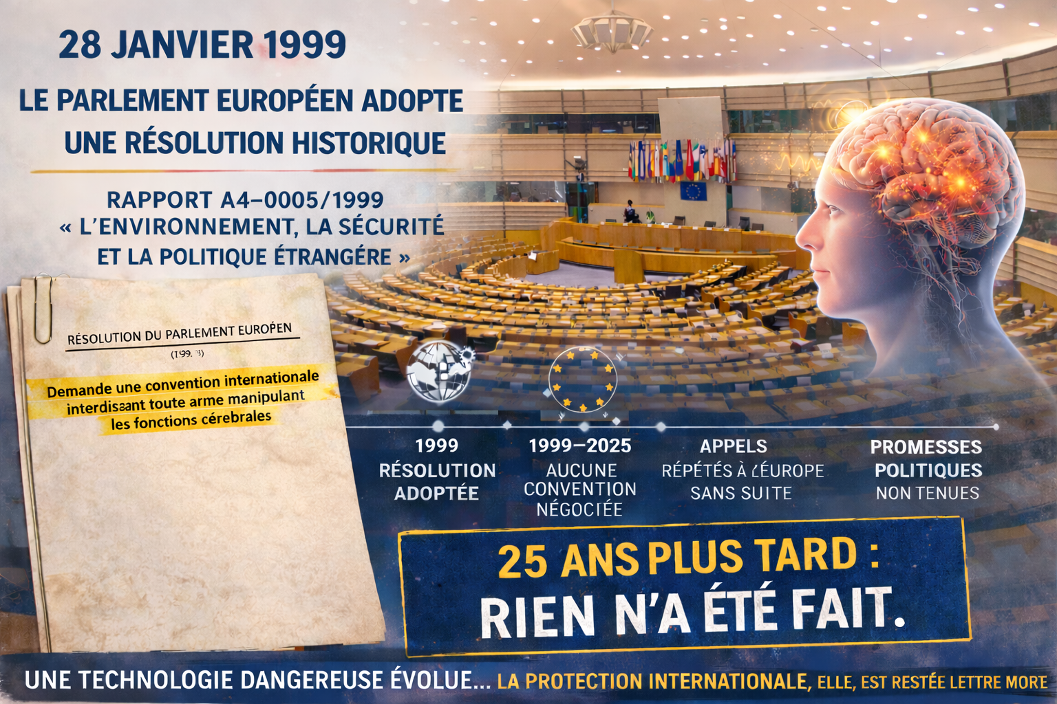Le 28 janvier 1999, dans le cadre du rapport A4-0005/1999 sur « l’environnement, la sécurité et la politique étrangère », le Parlement a adopté une résolution demandant une convention internationale interdisant toute arme manipulant les fonctions cérébrales qui incluait un appel clair (cf. page 11/§30) :